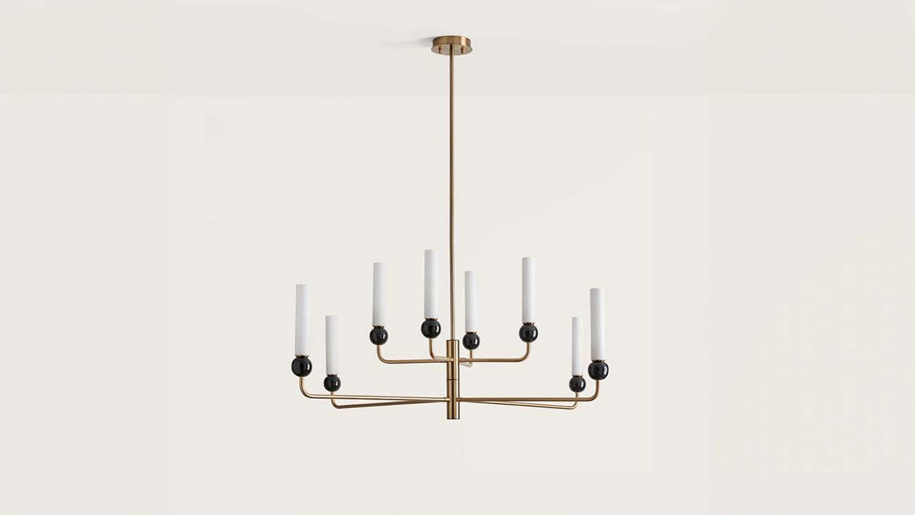 Závěsné svítidlo Delie od španělské firmy Aromas del Campo představuje nádherný a elegantní lustr, který osvěží váš interiér jedinečným stylem. Kombinace zlaté nebo černé základny dodává svítidlu noblesní vzhled. Osm mramorových koulí, které nesou válec vyzařující světlo, tvoří originální a luxusní design, který poutá pozornost.
