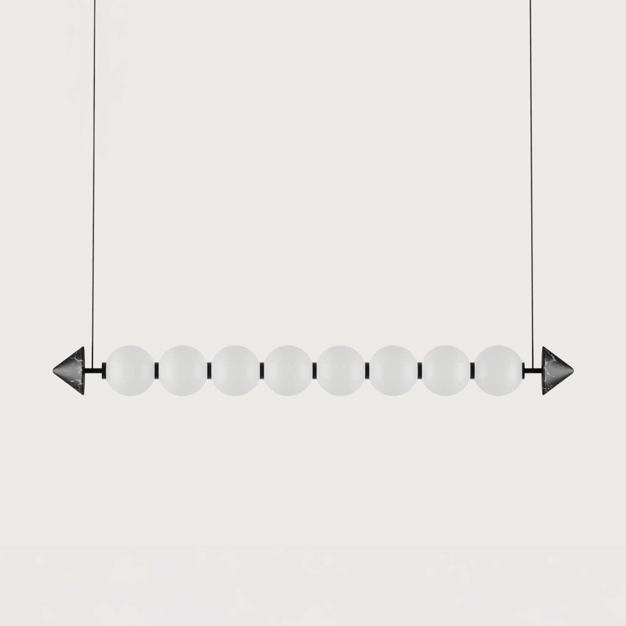 Soko-pendellampen fra det spanske mærke Aromas er et markant designelement, der kombinerer moderne æstetik med kvalitetsmaterialer. Lampen bruger et integreret LED-bånd med en effekt på 22 W, der giver en lysstrøm på 2250 lm med en varm lysfarve på 2700 K, hvilket er ideelt til at skabe en behagelig atmosfære. Lampens konstruktion består af en kombination af stål, marmor og glas, hvor glaskuglerne spreder lyset jævnt, mens de detaljerede afslutninger i sort marmor giver helheden et sofistikeret udseende. Soko er ophængt i tynde kabler, der giver den et elegant og næsten svævende udtryk. Ideel over spisebordet, i stuen eller i kommercielle lokaler, hvor den vil fungere som et stærkt visuelt element.