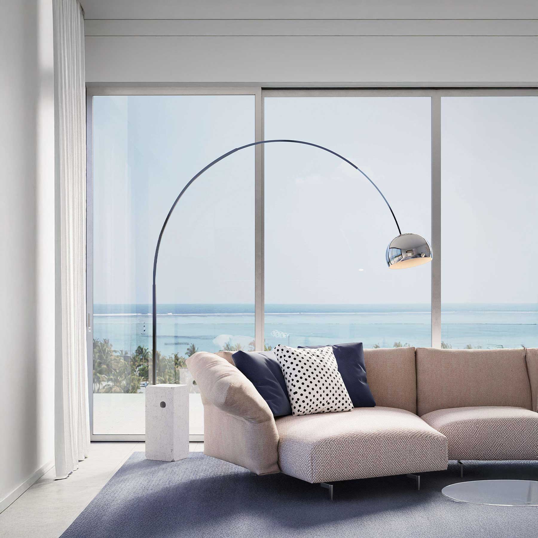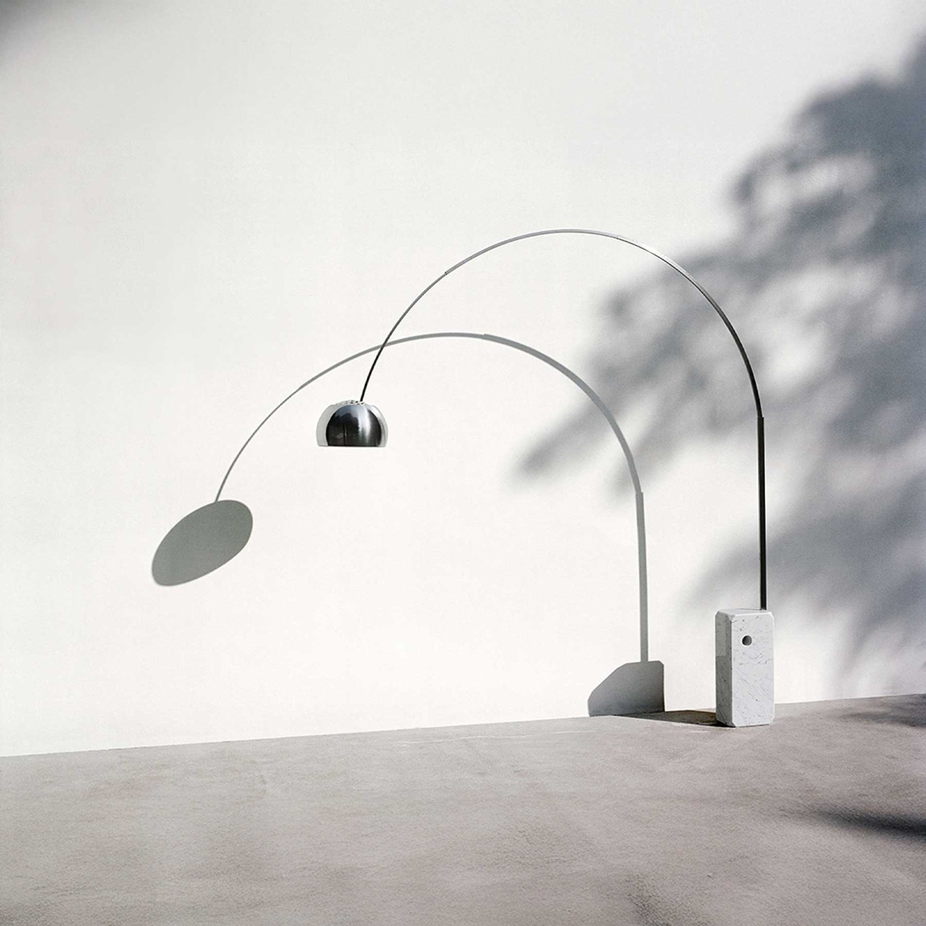 Svítidlo Arco od společnosti Flos je ikonická stojací lampa poskytující přímé světlo, navržená slavnými italskými designéry Achillem a Pier Giacomem Castiglioni v roce 1962. Má základnu z bílého kararského mramoru, teleskopický stojan z nerezové oceli s matnou povrchovou úpravou a otočný, výškově nastavitelný reflektor z leštěného hliníku s ochranným lakem. Díky elegantnímu obloukovému tvaru lze světlo umístit do prostoru bez nutnosti stropního uchycení. Lampa využívá LED technologii s teplotou chromatičnosti 2700K, světelným tokem 1224 lm a příkonem 28 W.