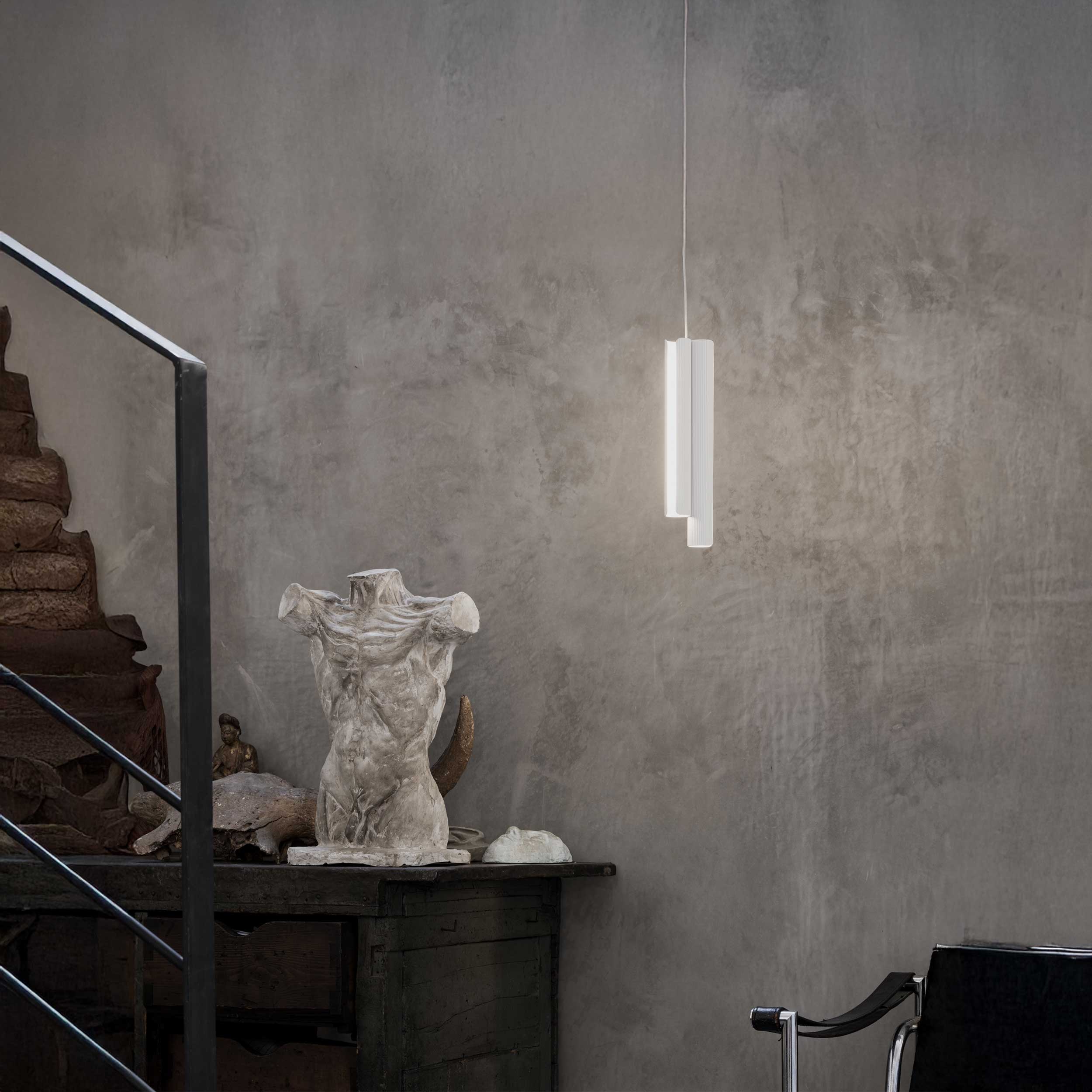 Závěs je řešen černým PVC kabelem, který podtrhuje minimalistický charakter svítidla. Model Dorica je dostupný v několika atraktivních provedeních – s drážkovaným (fluted) povrchem v barvách bílá, černá a s hladkým kartáčovaným povrchem v mosazném odstínu. Díky této variabilitě se svítidlo snadno přizpůsobí moderním i industriálně laděným interiérům a stává se výrazným designovým prvkem prostoru.