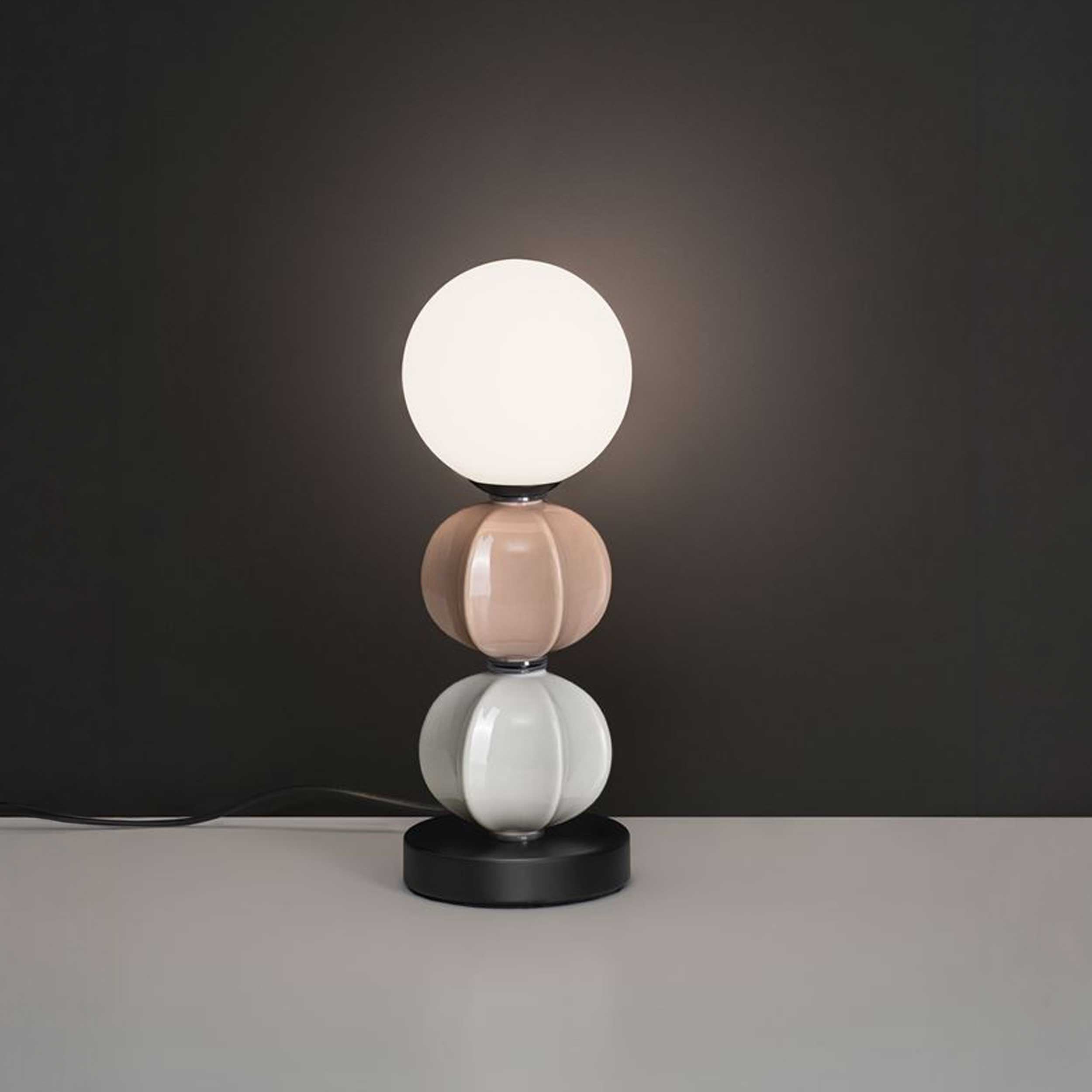 Bordlampen Dazz fra Nova Luce er et designelement med markant karakter, der kombinerer bløde farver, runde former og kvalitetsmaterialer. Den elegante sammensætning af keramiske og glaselementer skaber en harmonisk helhed, der passer perfekt til et moderne interiør – uanset om den står på natbordet, kommoden eller i stuen.